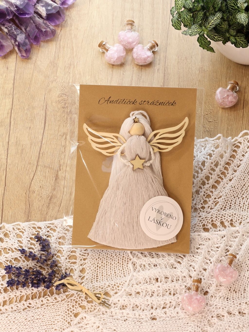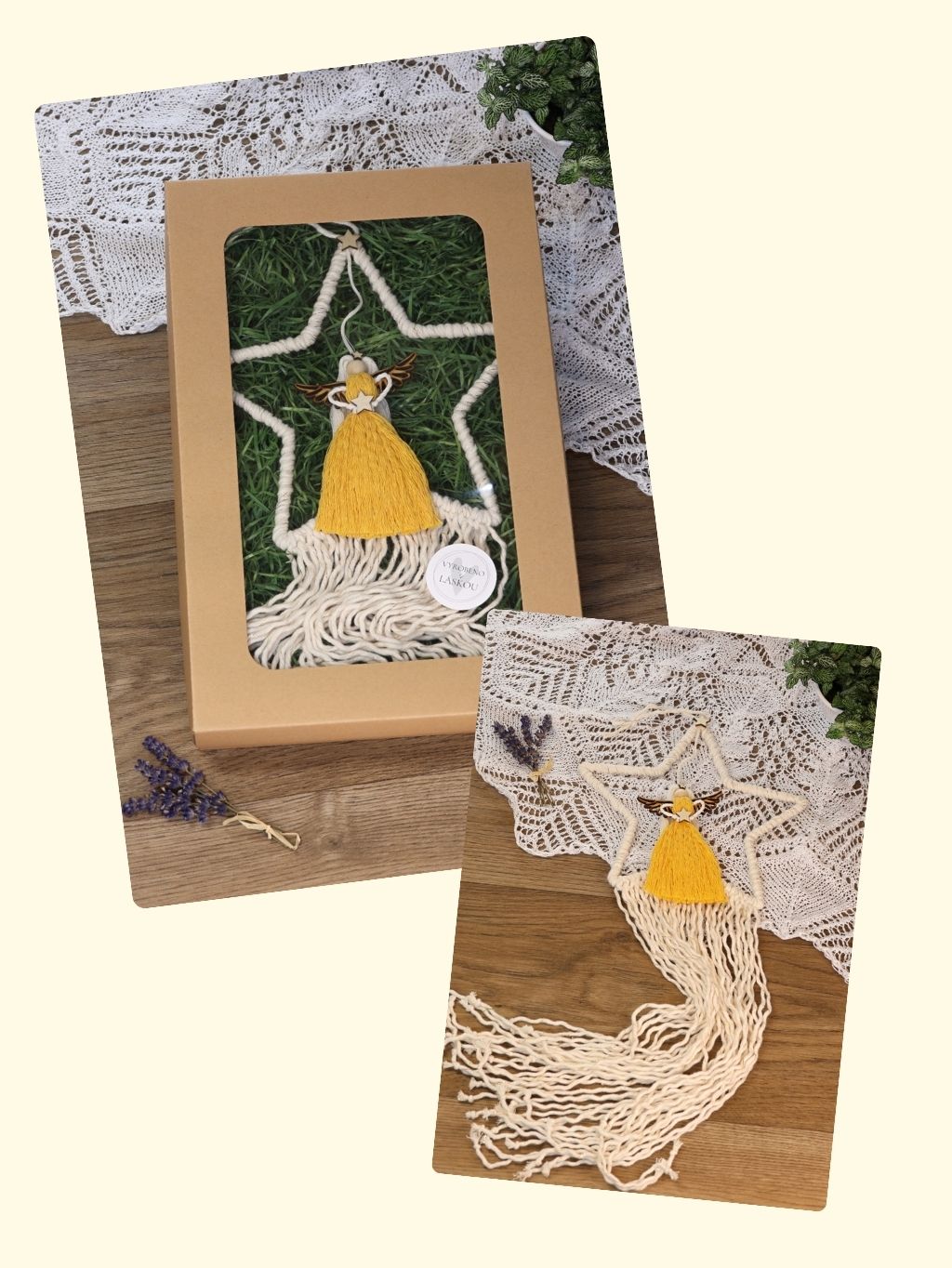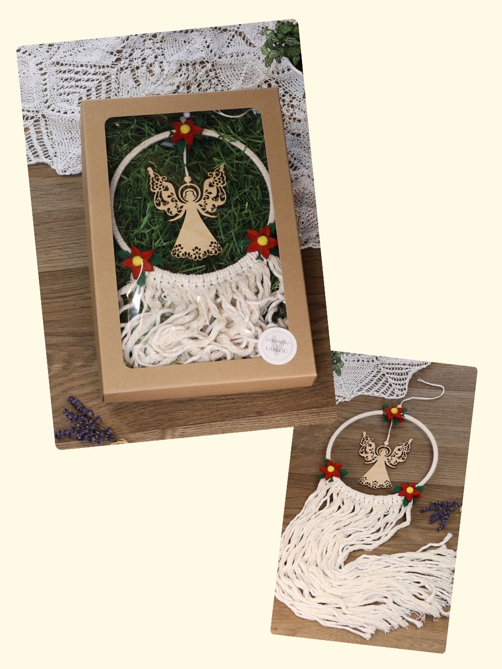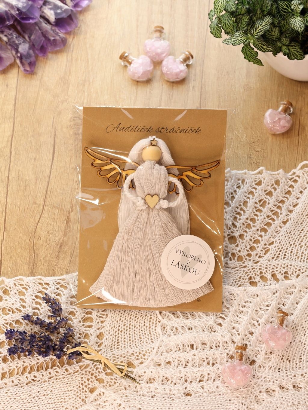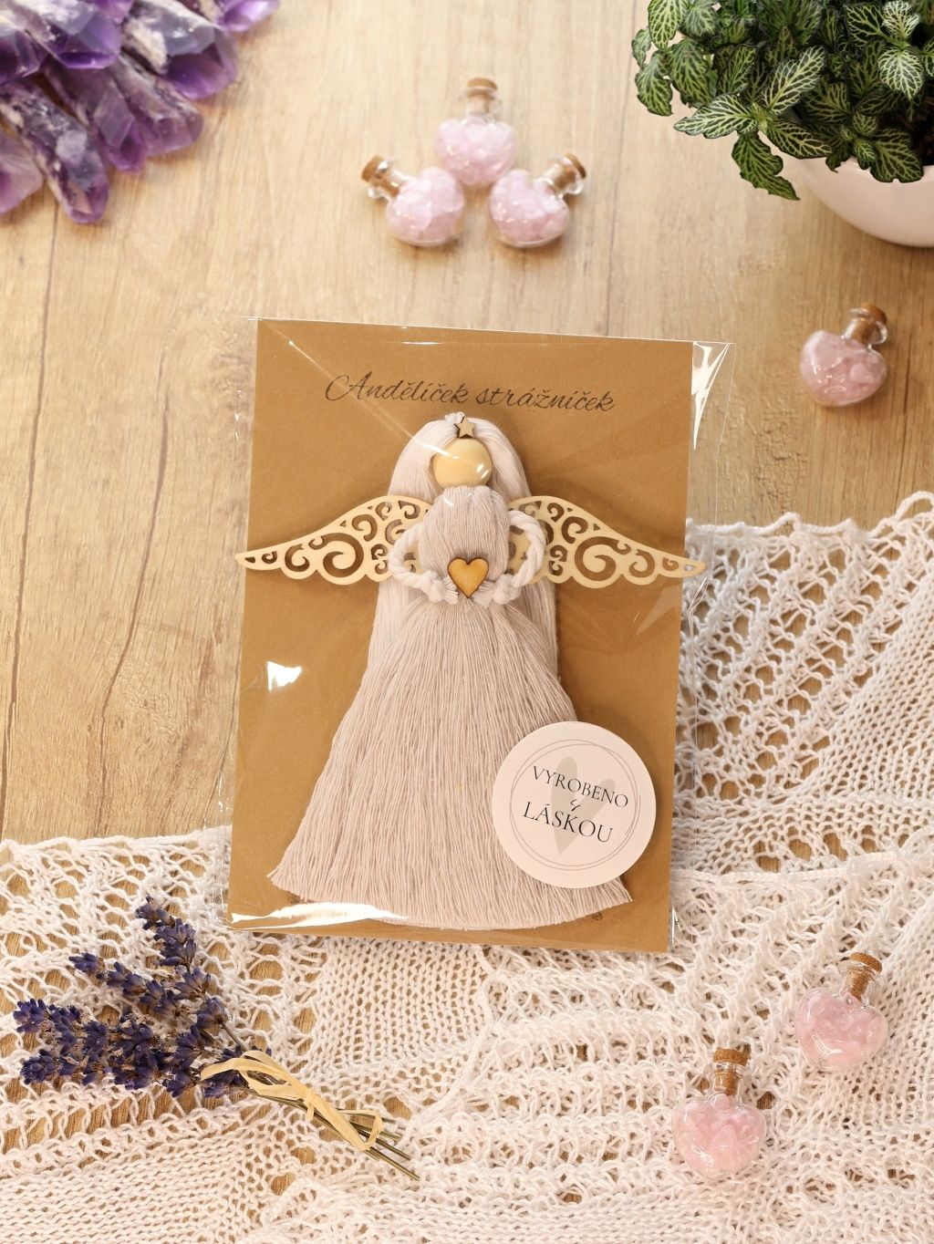 Macramé Andělíček strážníček vás na Vánoce naladí, dárkem potěší i dušičku láskou pohladí.