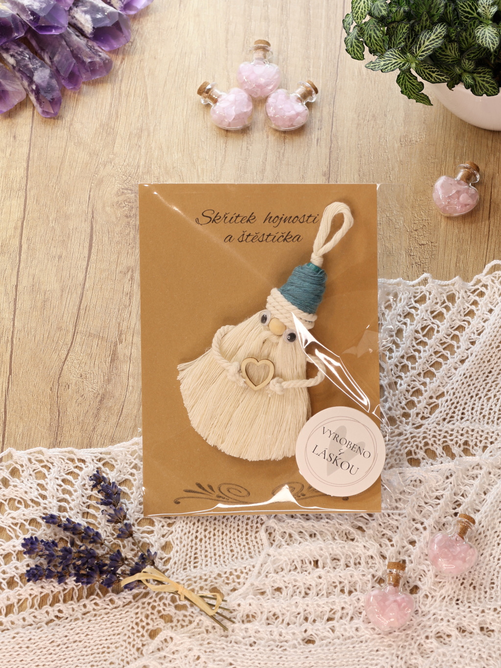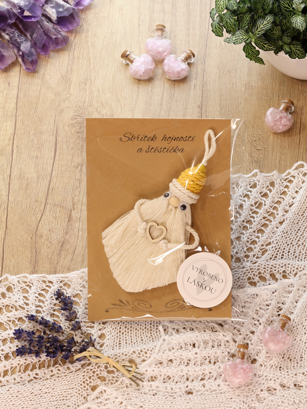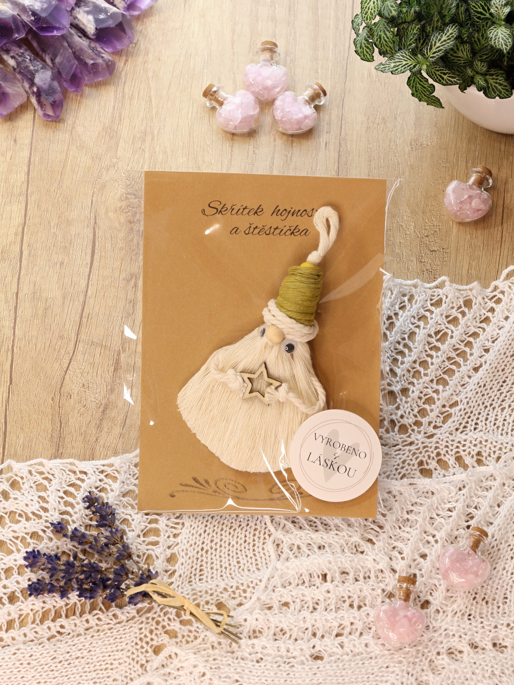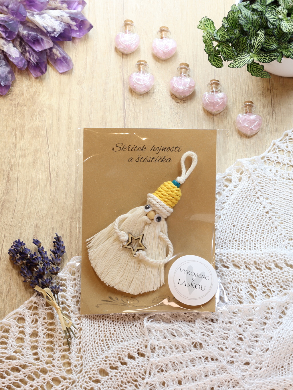 Macramé Skřítek hojnosti a štěstíčka na Vánoce naladí i dárkem darovaný potěší.