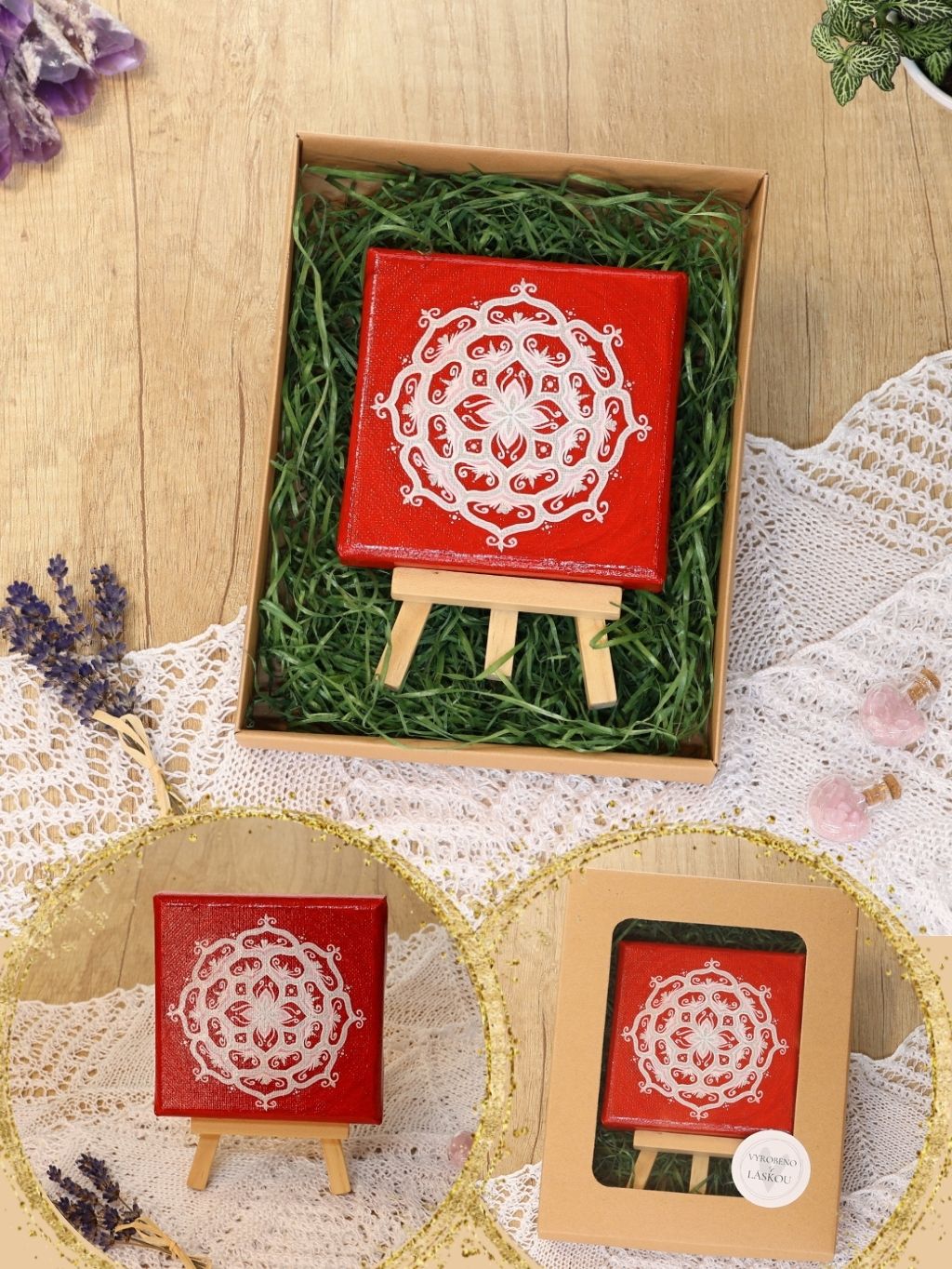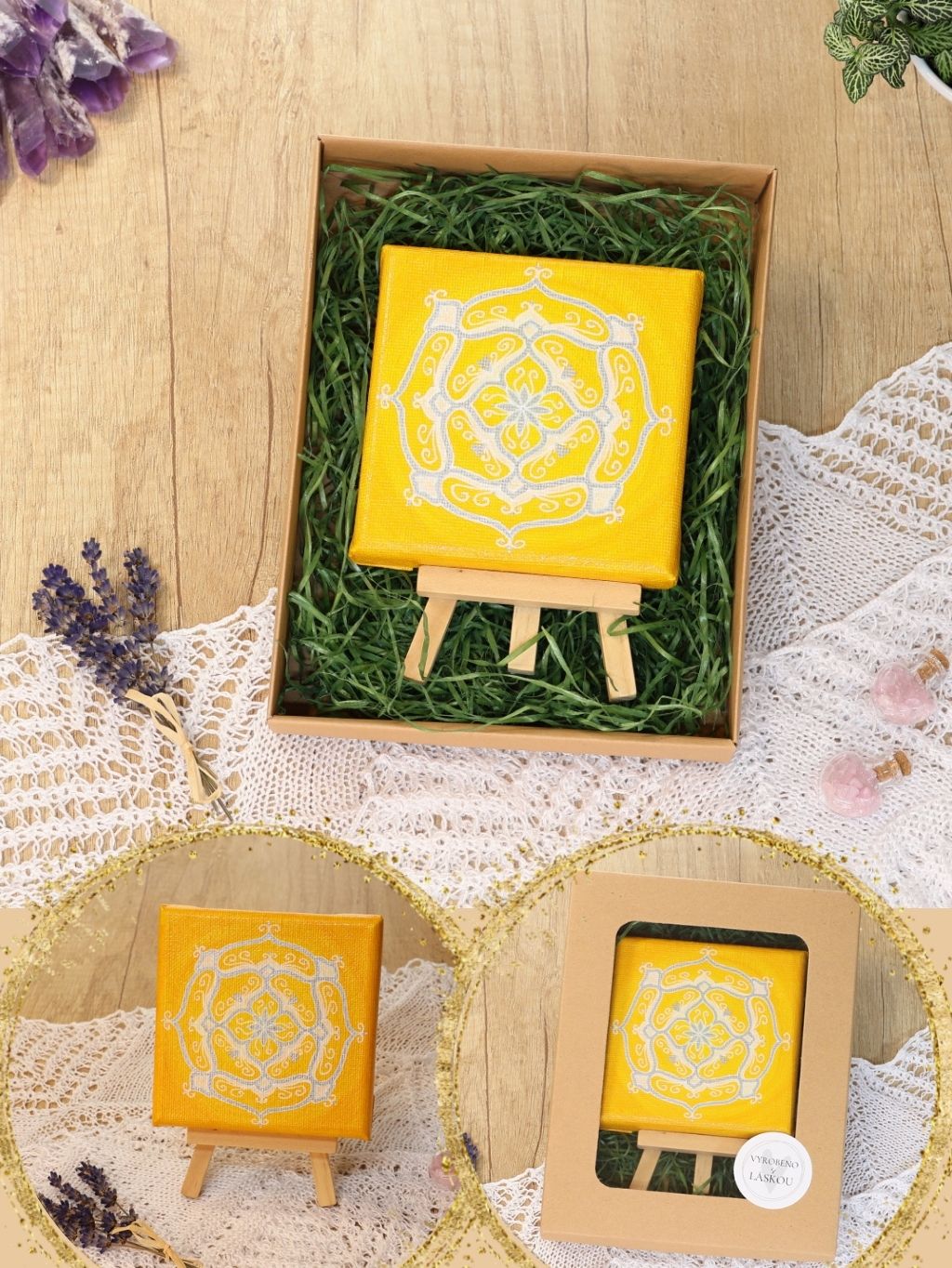 Malované i tečkované mandaly se stojánkem o velikosti plátna 10 x 10 cm. Povrch je lakovaný lesklým lakem pro zvýraznění jejich lesku a záře i pro praktickou údržbu. Dodání je včetně dárkové krabičky s výplní. Od každé je skladem 1 kus.
